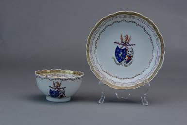 【广彩描金徽章纹花口形茶杯、托碟】