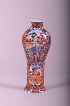 【清青花开光广彩人物图海棠形瓶】